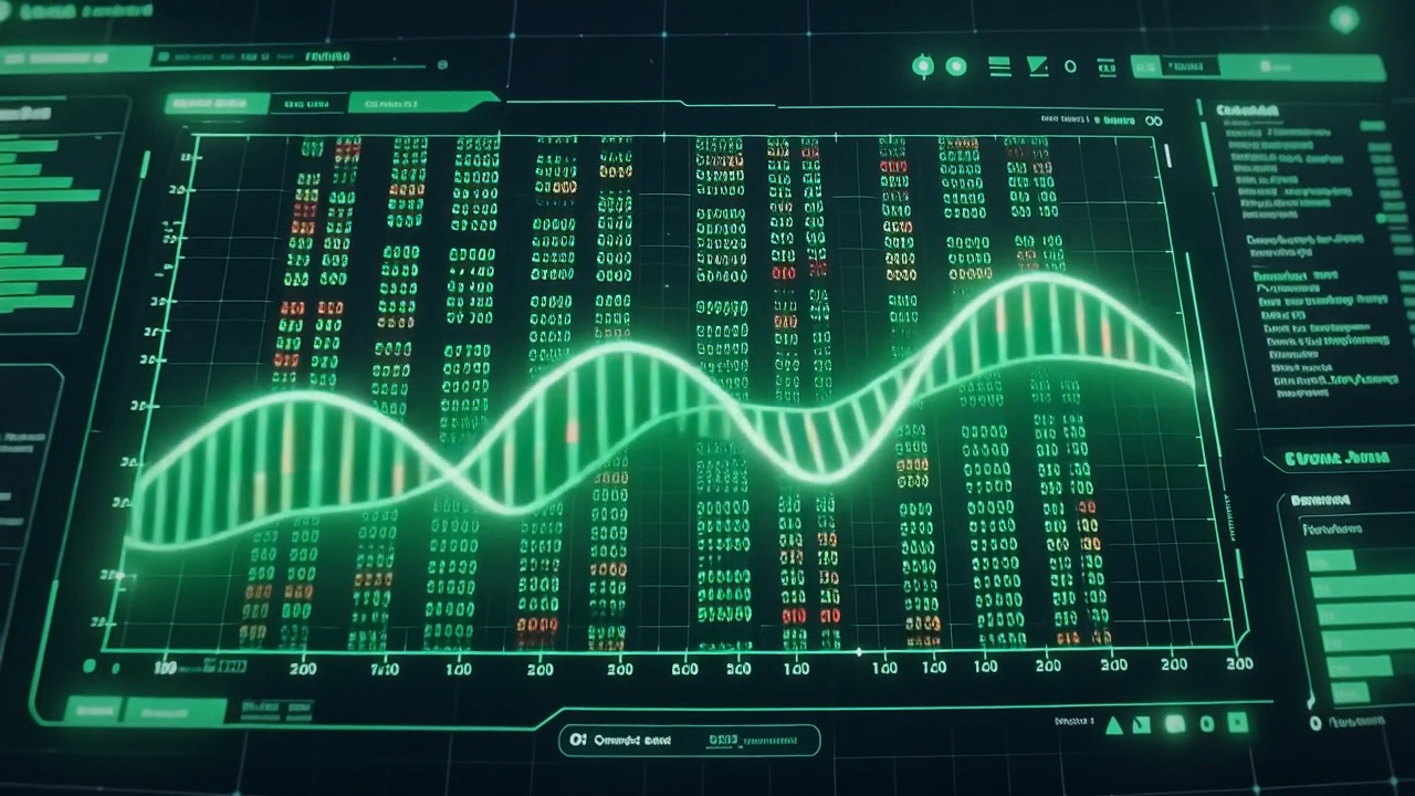 Lab-grade monitoring: genome sequencing reports, blood panel curves, and live CGM traces scrolling on AI dashboards.